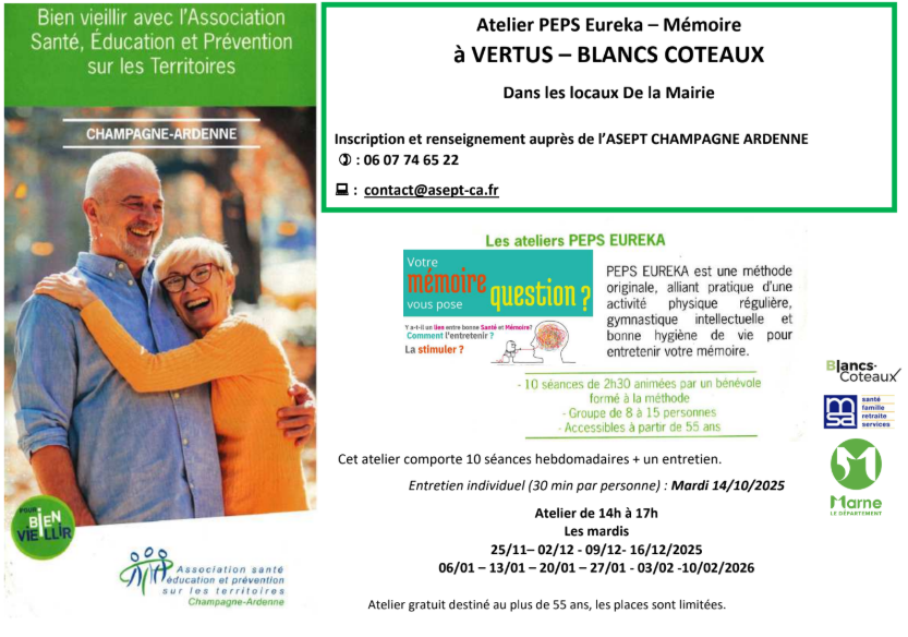 Atelier proposé par l’ASEPT Champagne Ardenne, avec le soutien des partenaires locaux. Programme PEPS Eureka – méthode originale pour entretenir la mémoire.